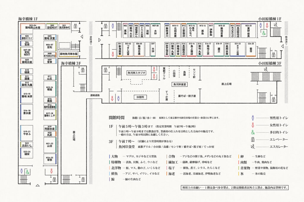 築地魚河岸は小田原橋棟と海幸橋棟の2棟で構成され、1階には水産や青果の仲卸などの店が軒を連ねています。新鮮で美味しい目利きの厳選食材をお求めに是非ご来場ください。 屋上の屋上広場は築地場外市場の貴重な憩いの場となっており、バーベキューなどのイベントも実施されています。 小田原橋棟の3階には「市場飯(いちばめし)」が食べられるフードコート形式の魚河岸食堂や、食のイベントを開催するキッチンスタジオ、イベントスペースも設けられています。