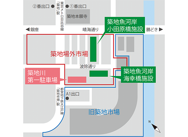 築地魚河岸は、築地市場移転後も築地の活気とにぎわいを将来に向けて継承するため、中央区が設置した、仲卸を経営母体とした小売り店など約60軒が入居する生鮮市場です。 築地魚河岸は「食のプロに支持され、一般客・観光客にも親しまれる、食のまち築地のにぎわいの拠点となる施設」を目指しています。